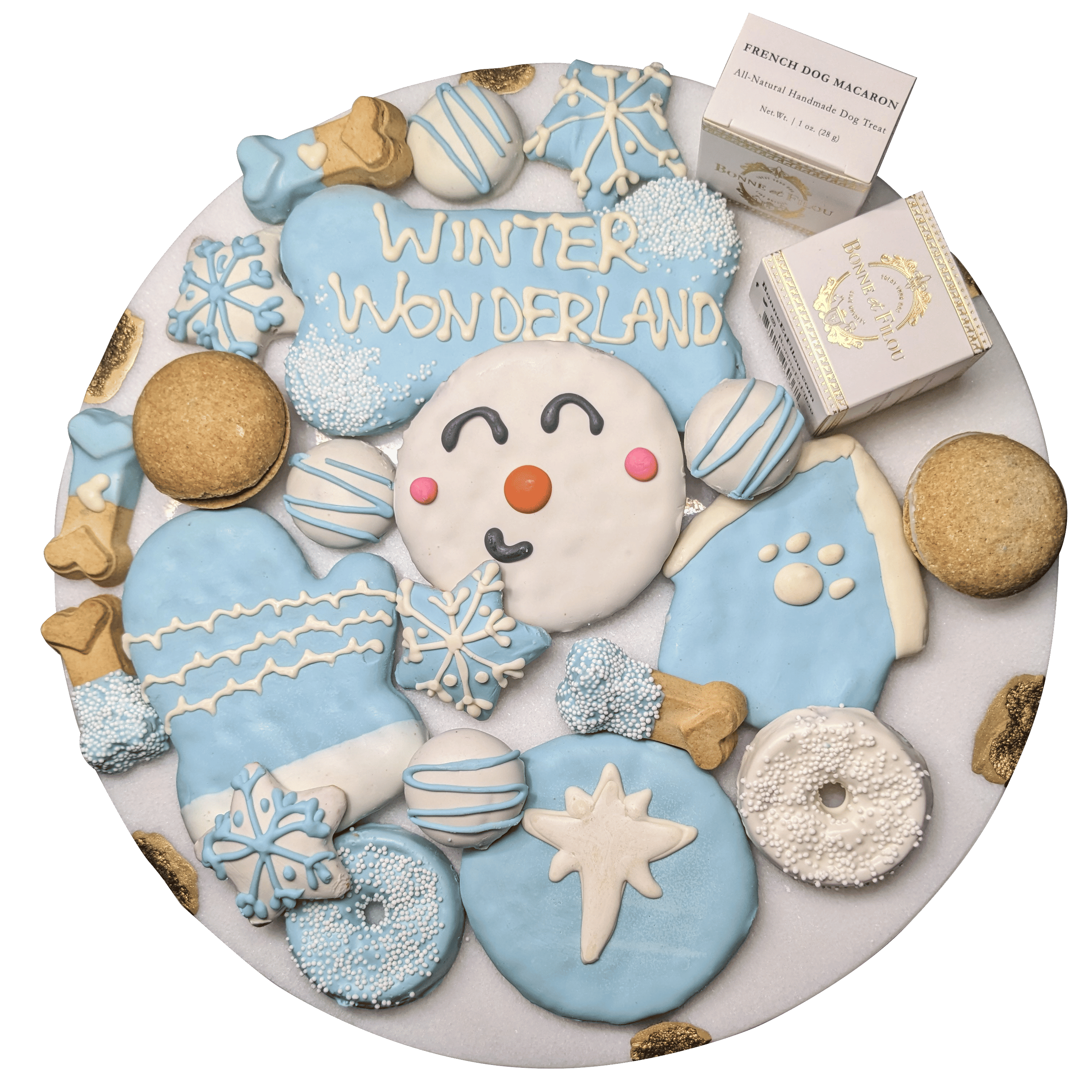 Includes 21 themed treats including snowman & snowflakes treats, winter biscuits, and dog macarons