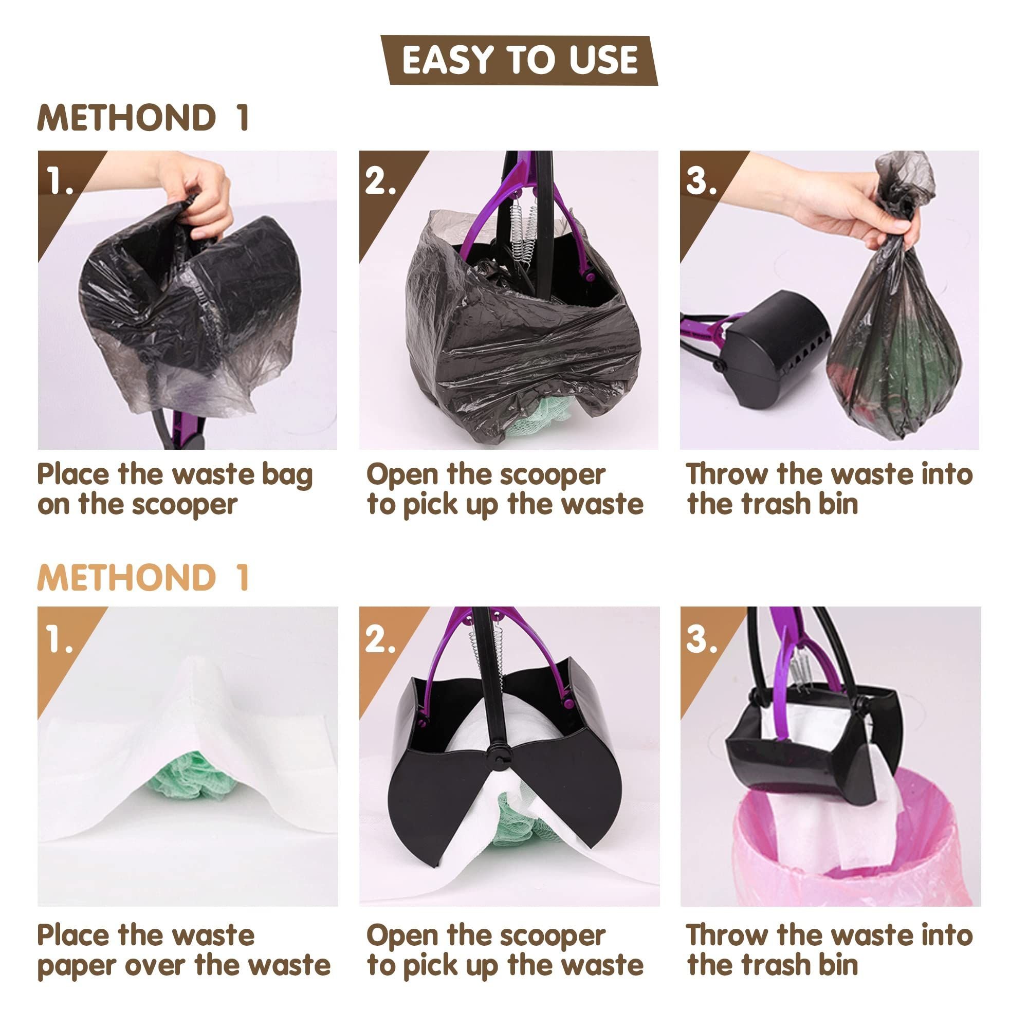 3.Compactness. The foldable design makes the dog waste scooper convenient for travel or walking. A dog pooper scooper for yard unfolds quickly and effortlessly, without getting stuck. You can use the dog waste grabber with a paper or plastic bag to prevent it from getting dirty.