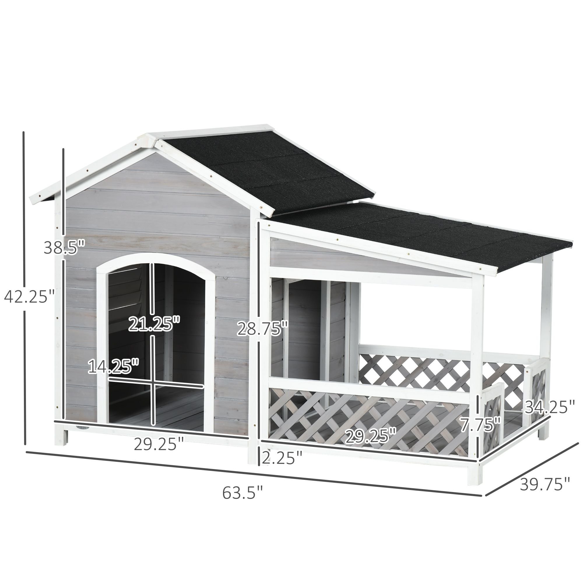 5.- Dog House with Door Info: Overall Dimensions: 63.5" L x 39.75" W x 42.25" H. Assembly required..