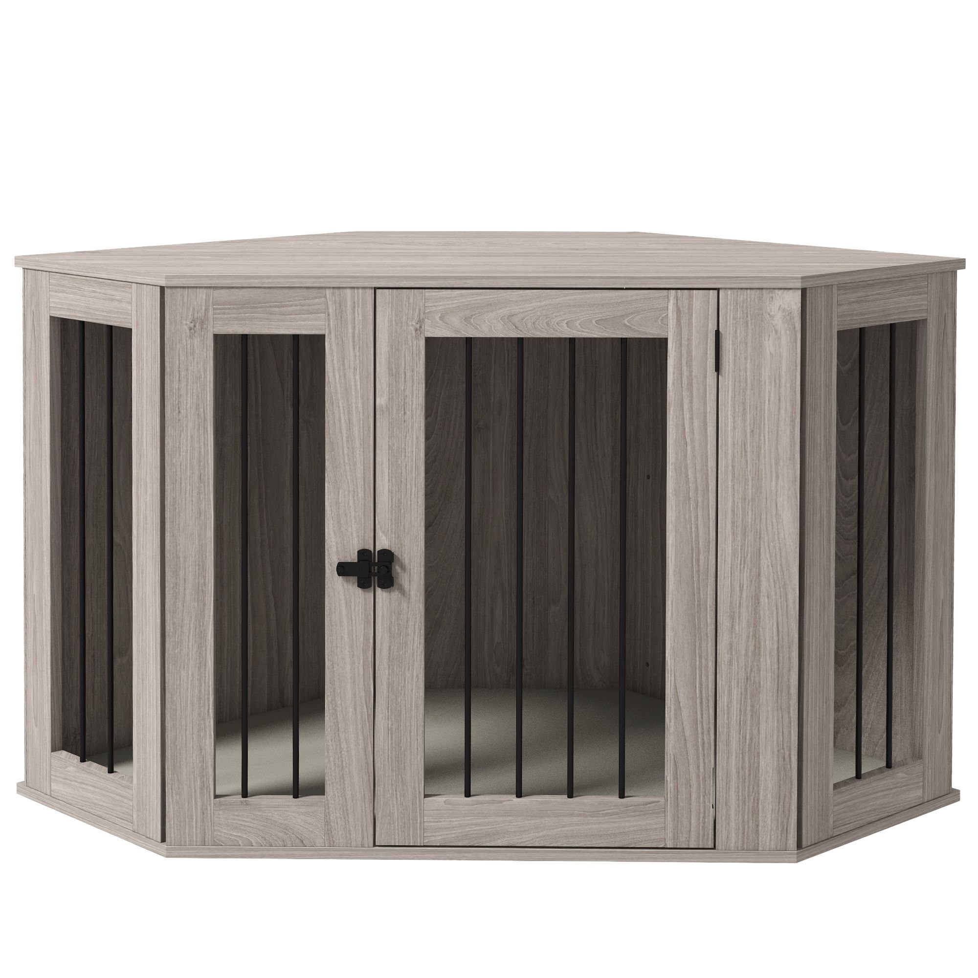 Decorate your home with a design that has a modern shape and a wood grain look. The corner design makes it easier to place our dog crate table for large-sized dogs against a wall or sofa. The large door makes it easy for dogs to get in and out, and its soft cushions are easy to clean. When you make this convenient PawHut dog crate furniture part of your home, you'll have the integrity needed to endure daily wear and tear. Give your pet a place all their own; give your dog a PawHut.