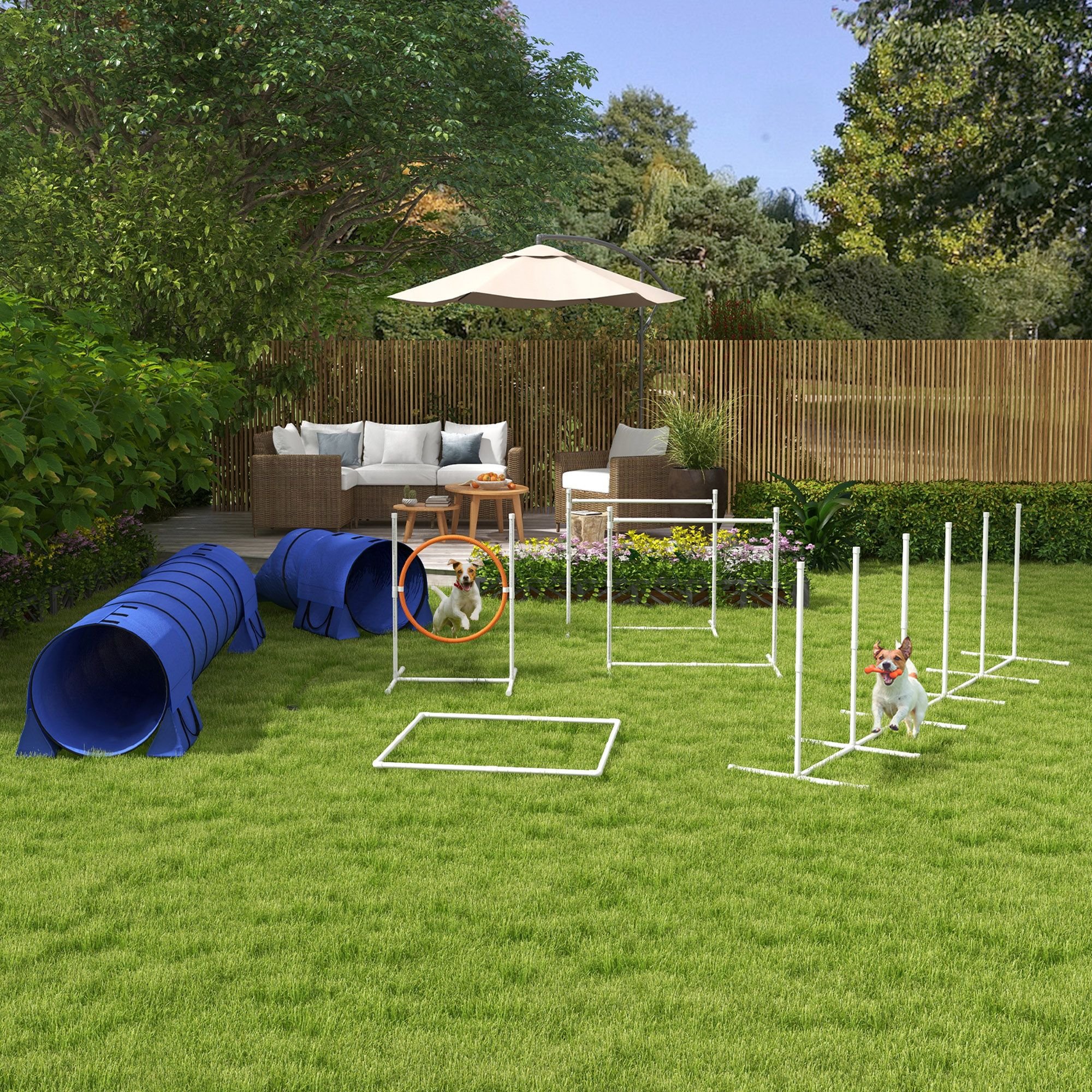 - - This 7-piece set includes weave poles, a pause box, two adjustable hurdles, an adjustable jumping ring, and two tunnels