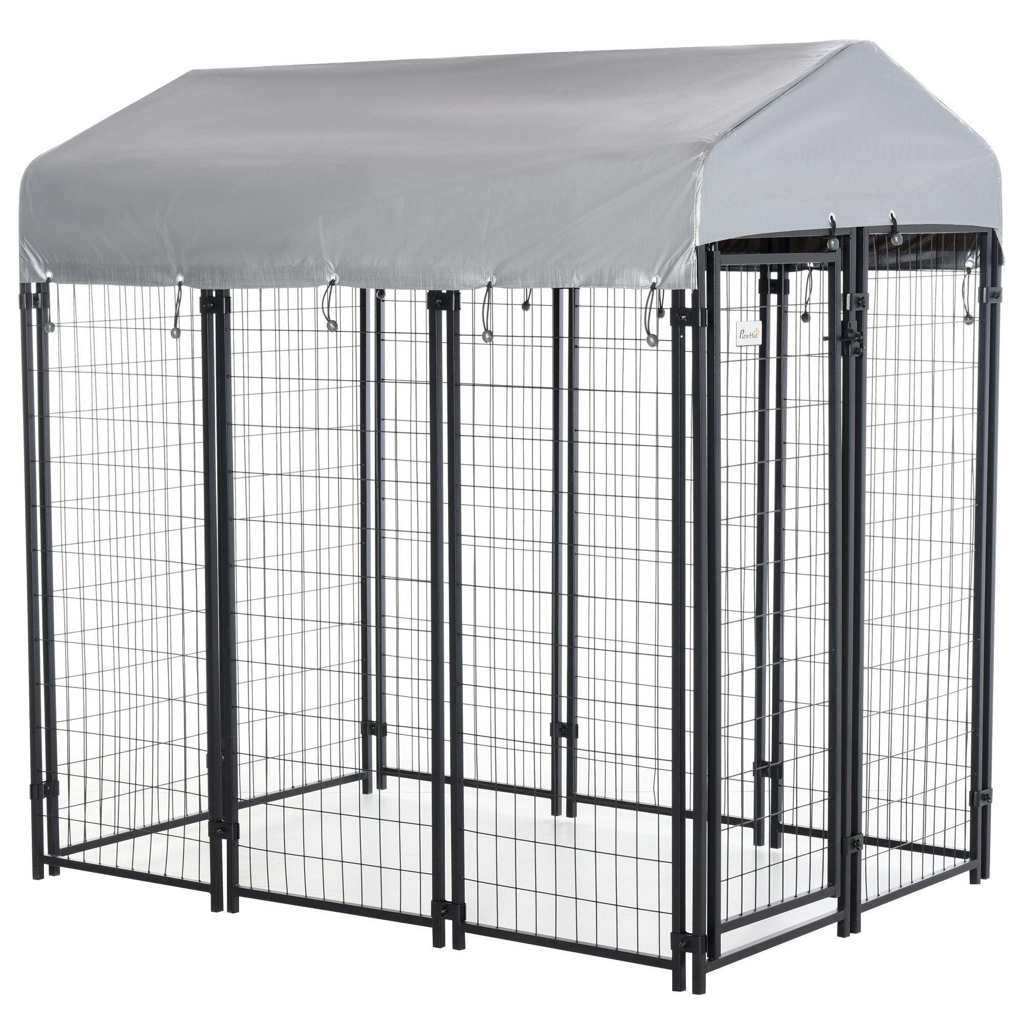 This metal dog kennel with a covered roof from PawHut has everything you need to quickly and easily assemble a professional outdoor enclosure for the safety of your pet. A tough metal frame ensures years of use with little to no necessary maintenance and is light enough to be relocated. This chain link dog kennel can grow with multiple kennels and can be connected together without additional parts to create a much larger enclosure to keep up with your growing pet, or multiple animals! This metal dog playpen helps keep your pets secure from predators, the weather, and other hazards while outdoors and is suitable for most medium animals including dogs, cats, and chickens. A durable tarp cover helps keep your pets protected from the weather and outside elements. Increased sun protection prevents ripping, cracking, fading, or peeling while durable elastic cords hold the cover securely to the frame for a snug fit. The pitched roof of the pet cage allows water, debris, and light snow to easily run off instead of accumulating. The raised legs make the playpen easy to hose or sweep to prevent dirt buildup.